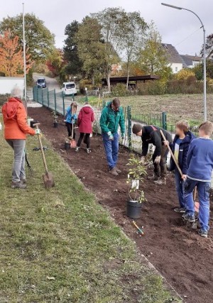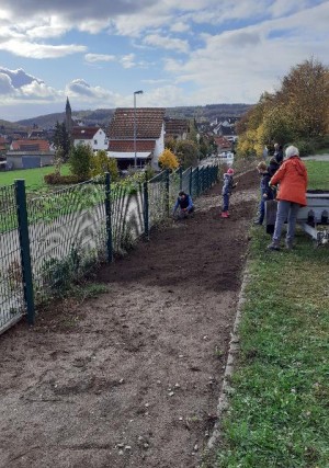 Der Kompost wurde dankenswerterweise vom Kompostwerk Essenheim gespendet und verschafft den noch zarten Pflänzchen einen ordentlichen Start. Dann ging es auch schon ans Pflanzen. Standortgerechte Gehölze und Stauden sollten nun in die Erde gebracht wer-den. Die freiwilligen Helfer und die Kinder der Wald-AG wurden nicht müde, für jede Pflanze einen geeigneten Platz zu finden.
