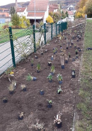 Es wurden Obststräucher und Wildfruchtgehölze gesetzt, die neben den Blüten für die Bienen auch noch etwas zum Naschen bieten: Brombeere, Kornelkirsche und Felsenbirne bereichern den Hang. Katzenminze, Thymian, Gamander und Lavendel sorgen ab jetzt das ganze Jahr über für Blütenreichtum und Nektar. Sie sind trockenheitsresistent (was bei den immer heißer werdenden Sommer wichtig ist) und schützen den Hang mit ihren Wurzeln gegen Erosion. Eine solche Pflanzung benötigt wenig Pflege, die Pflanzen sind frosthart und robust. Bodendecker wie Thymian und Bohnenkraut bilden mit den Jahren einen duftenden Teppich, bei dem unerwünschte Beikräuter keine Chance haben. Das lästige Jäten gehört der Vergangenheit an und das Beet wird mit den Jahren immer schöner.