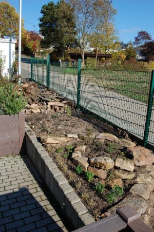 Aus einem ökologisch minderwertigen Hang ist ein vielfältiges Biotop geworden, bei dem die Kinder tagtäglich die Entwicklung verfolgen können. Ein gutes Anschauungsbeispiel auch für Diejenigen, die mit ihrem Garten nicht viel Arbeit haben wollen – pflegeleicht, schön und ökologisch sinnvoll.