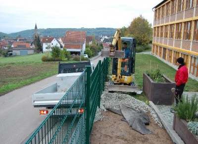 Der erste große Schritt – das Abräumen der Fläche – war mehr Aufwand als sich mancher Schottergartenbesitzer vor-stellen würde. Ohne schweres Gerät war nichts zu machen. Mit einem Bagger und vielen zupackenden Händen wurde der Mutterboden ans Tageslicht geholt.